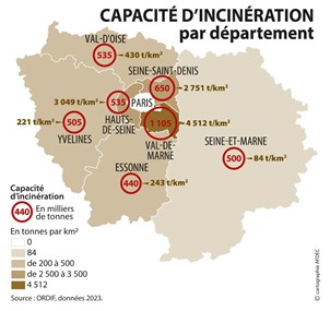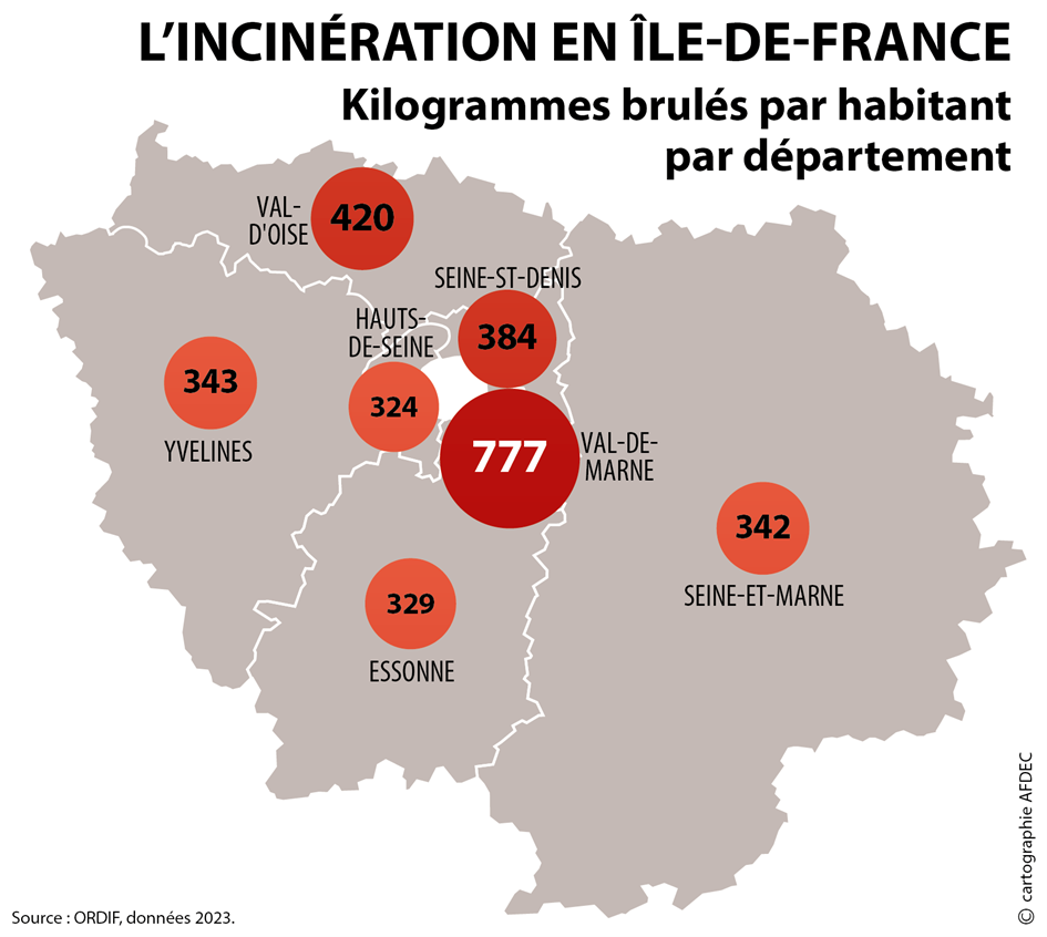 Les habitants du Val-de-Marne respirent les fumées de la combustion de deux fois plus de déchets par habitant que les autres habitants d’Ile-de-France. Cela correspond à 54 fois plus de déchets brûlés par km2 par rapport aux habitants de Seine-et-Marne alors que nous ne produisons pas plus de déchets par habitant que les autres Franciliens.